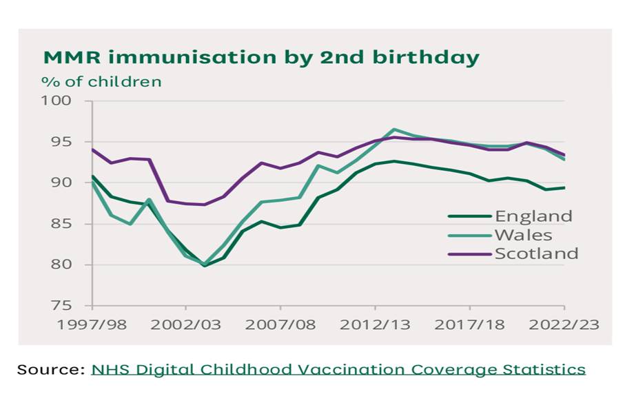 Figure 2 shows the uptake for the first MMR vaccine from 1997 right the way through to 2023. The effect of Wakefield’s atrocious research can be seen clearly 2000-2004, then a recovery occurs, some of it before the 2011 BMJ refutation. Uptake in Scotland and Wales almost reach the WHO target of 95% uptake, England’s uptake remains below 90%.